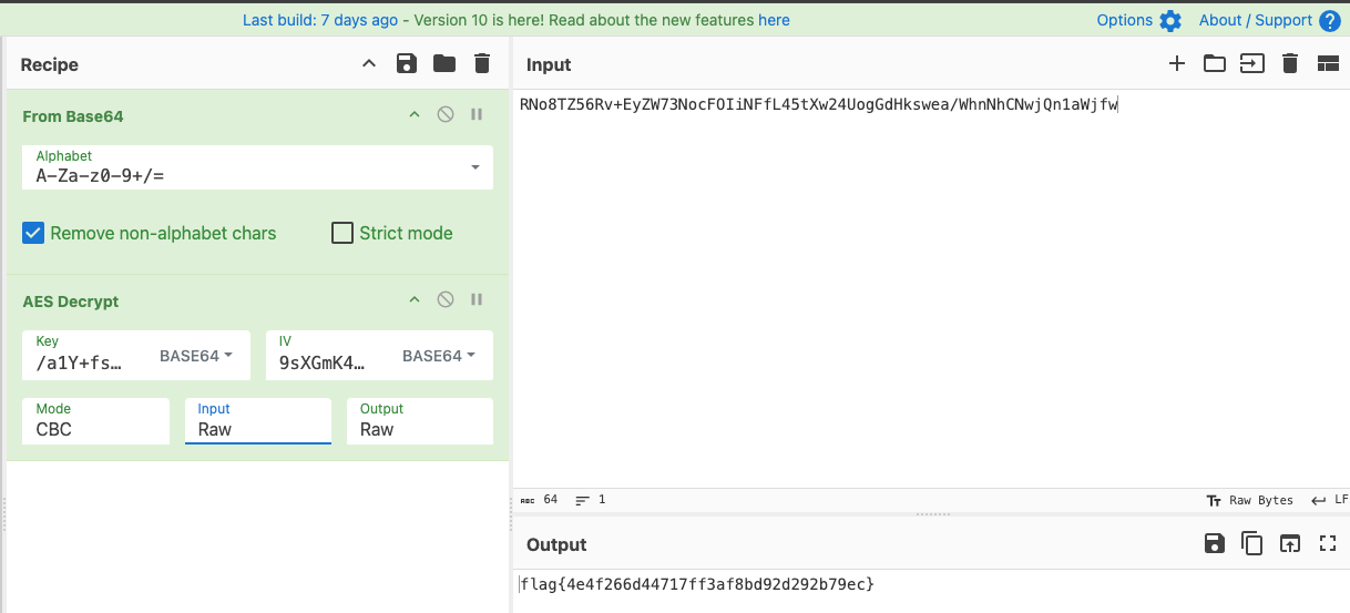 I then used CyberChef to decode it, revealing another layer, this time encrypted with AES.